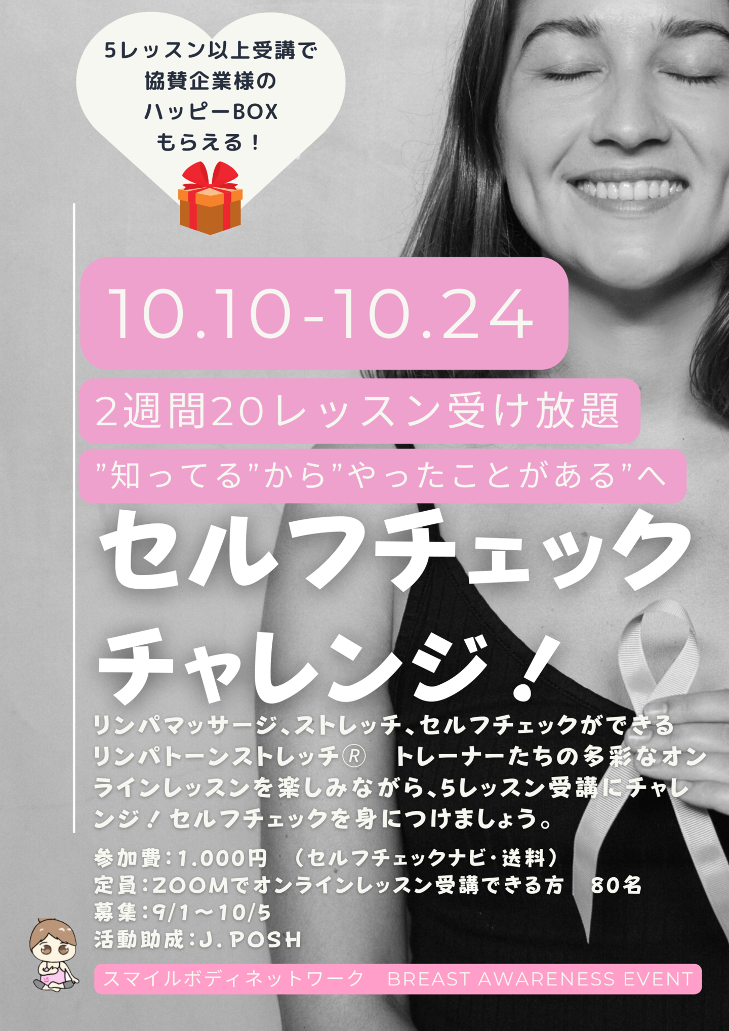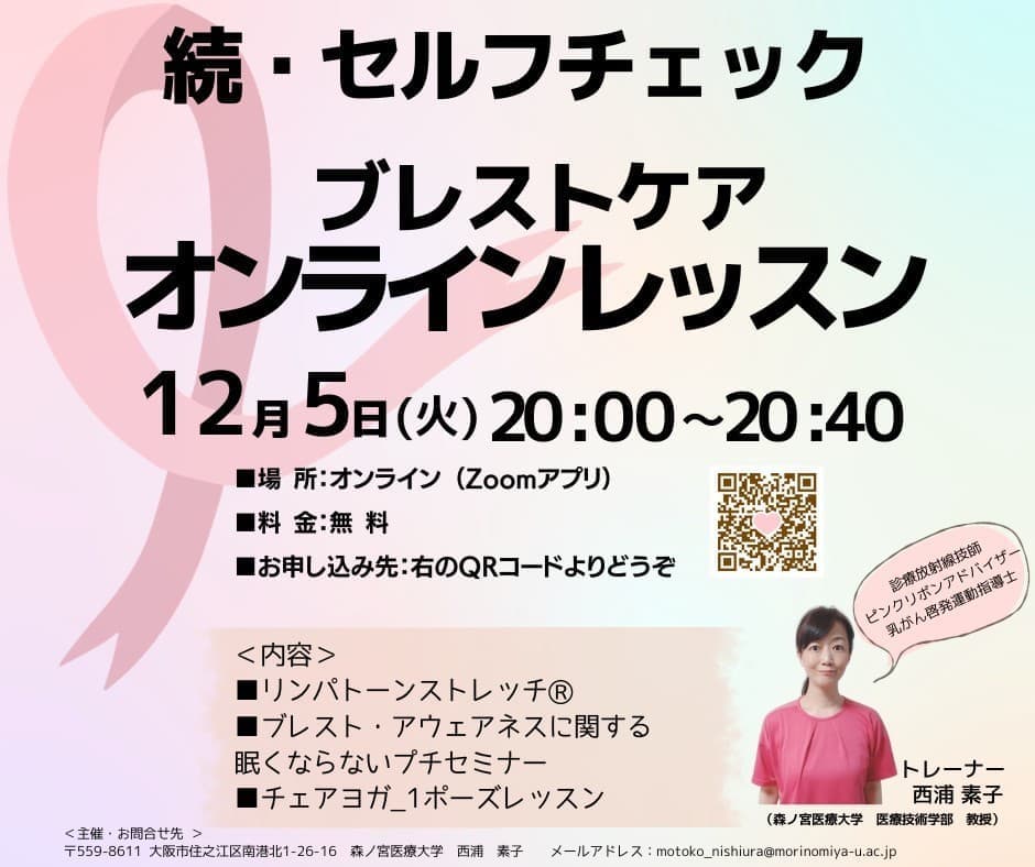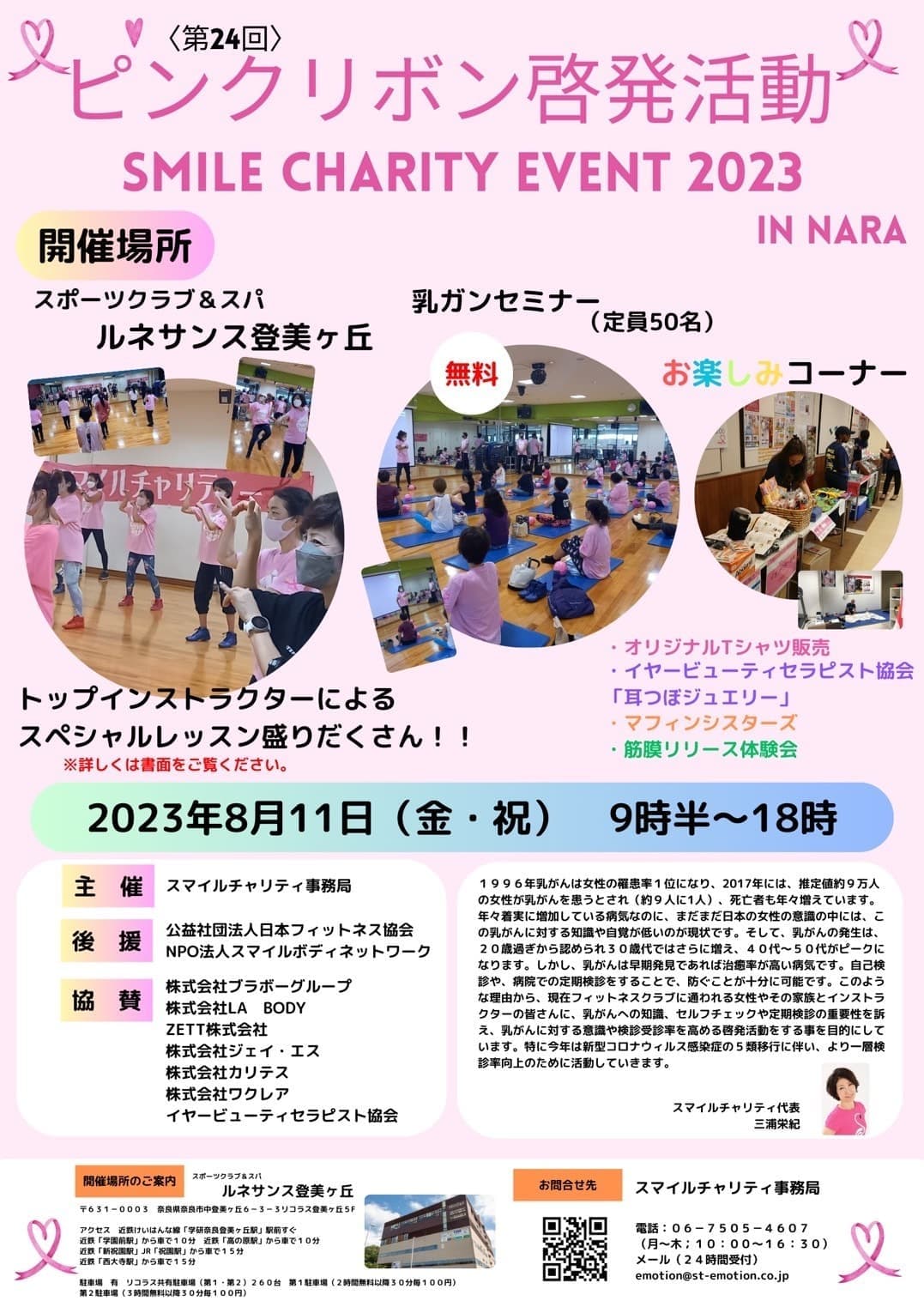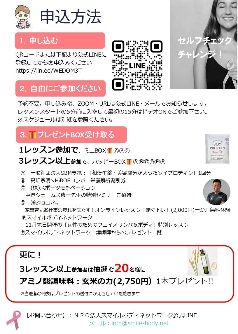 | 参加費 | イベントレッスン 参加費 1クラス 1500円(税込) 医師による乳がん無料セミナー |