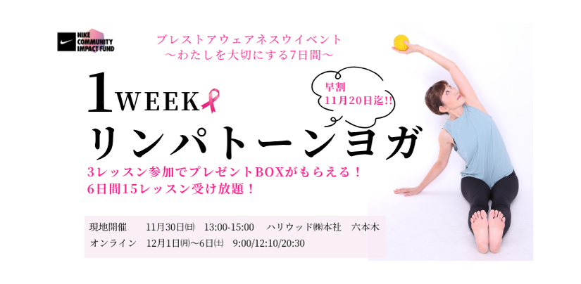 | スケジュール | 13:00 開会挨拶/NIKEプロジェクト ビデオメッセージ 13:15 リンパトーン&ボディトーンストレッチ 13:45 休憩 14:00 リンパトーンヨガ 14:50 写真撮影/お土産(ソイプロ・ピンクスイーツお渡し) |