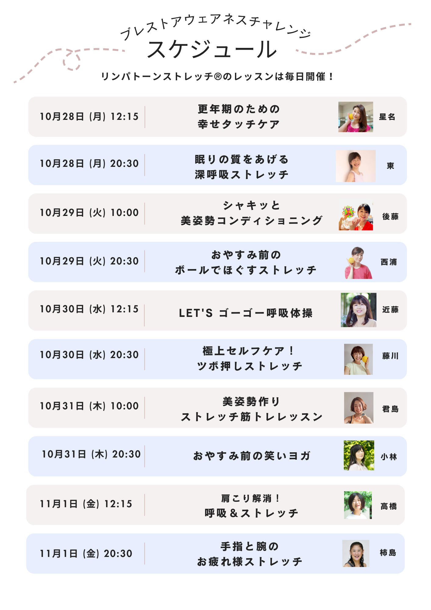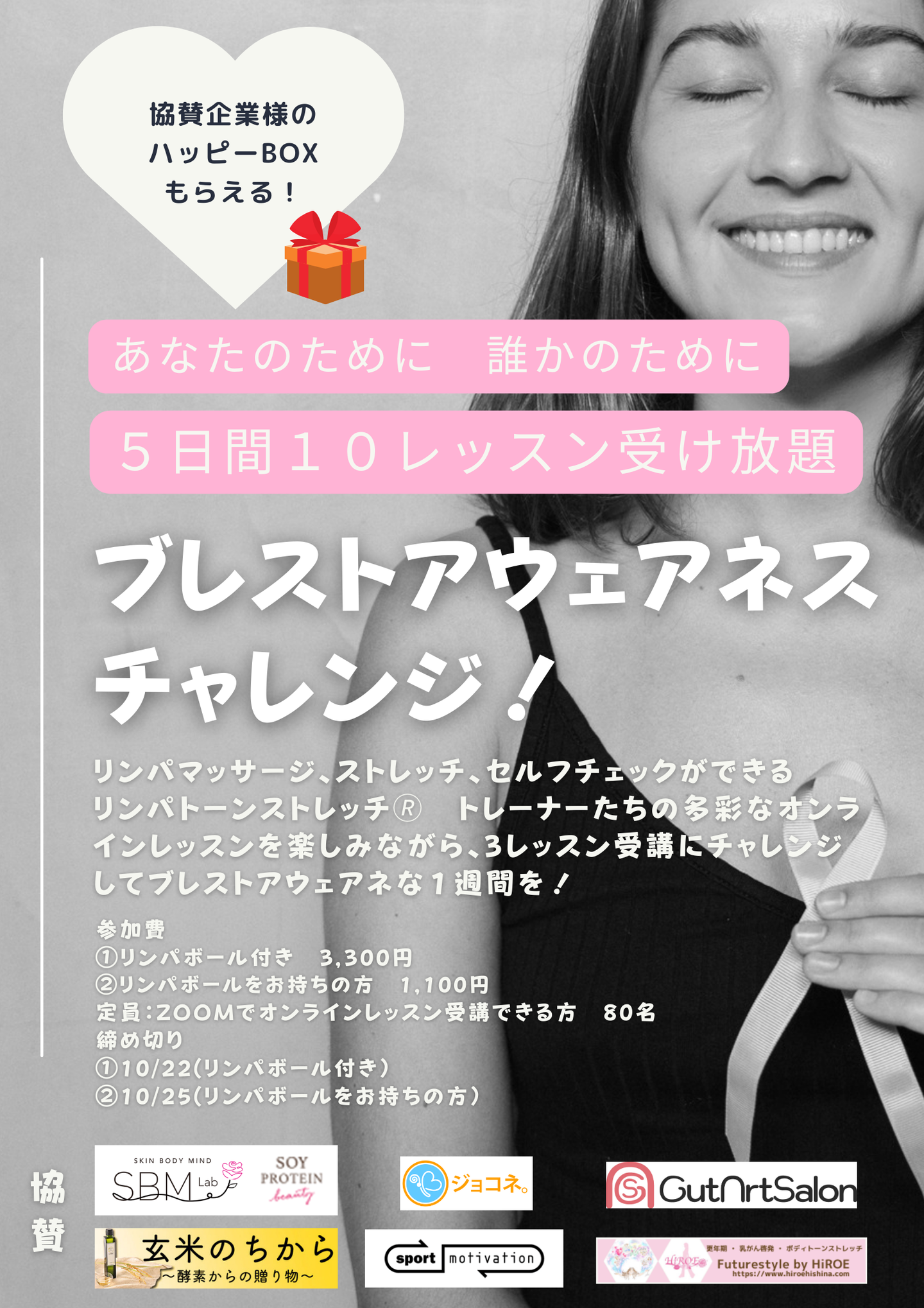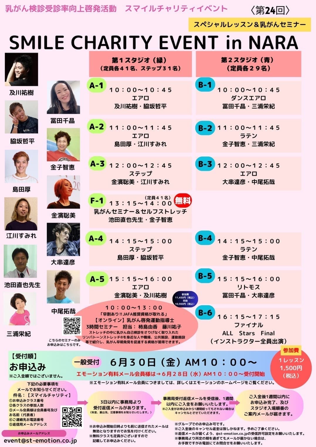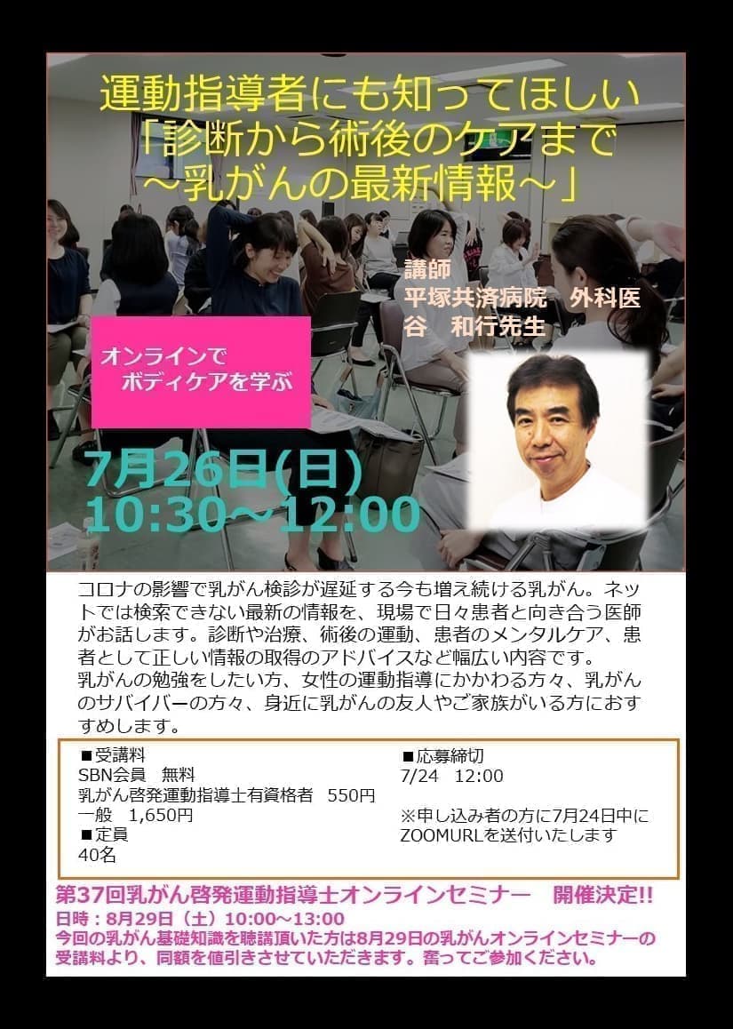 | 参加費 | イベントレッスン 参加費 1クラス 1500円(税込) 医師による乳がん無料セミナー |