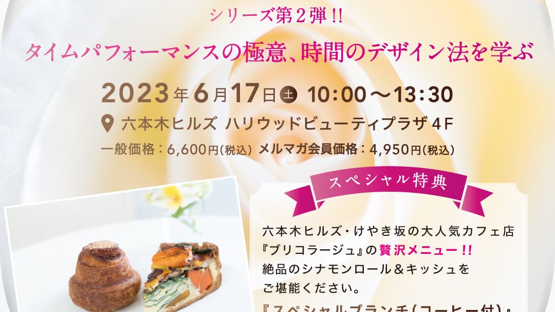 | タイムスケジュール | 9:45 受付開始 10:00 ブランチタイム(30分)六本木ヒルズのけやき坂にある大人気カフェ店『ブリコラージュ』のスペシャルメニューを楽しみながら、参加者のみなさまによる自己紹介 10:30 第1部「タイパ運動、短時間で効率よく身体が整う簡単エクササイズ」(60分) 11:30 休憩<名刺交換/ネットワークづくり>(20分) 11:50 第2部「美容コーチングタイム」(20分) 12:10 第3部「大きな石と四つ葉のクローバーで考える時間デザイン法」(60分) 13:10 質疑応答&アンケート記入 13:30 セミナー終了、ギフトをお渡し、ピアノの生演奏でフィナーレ |
