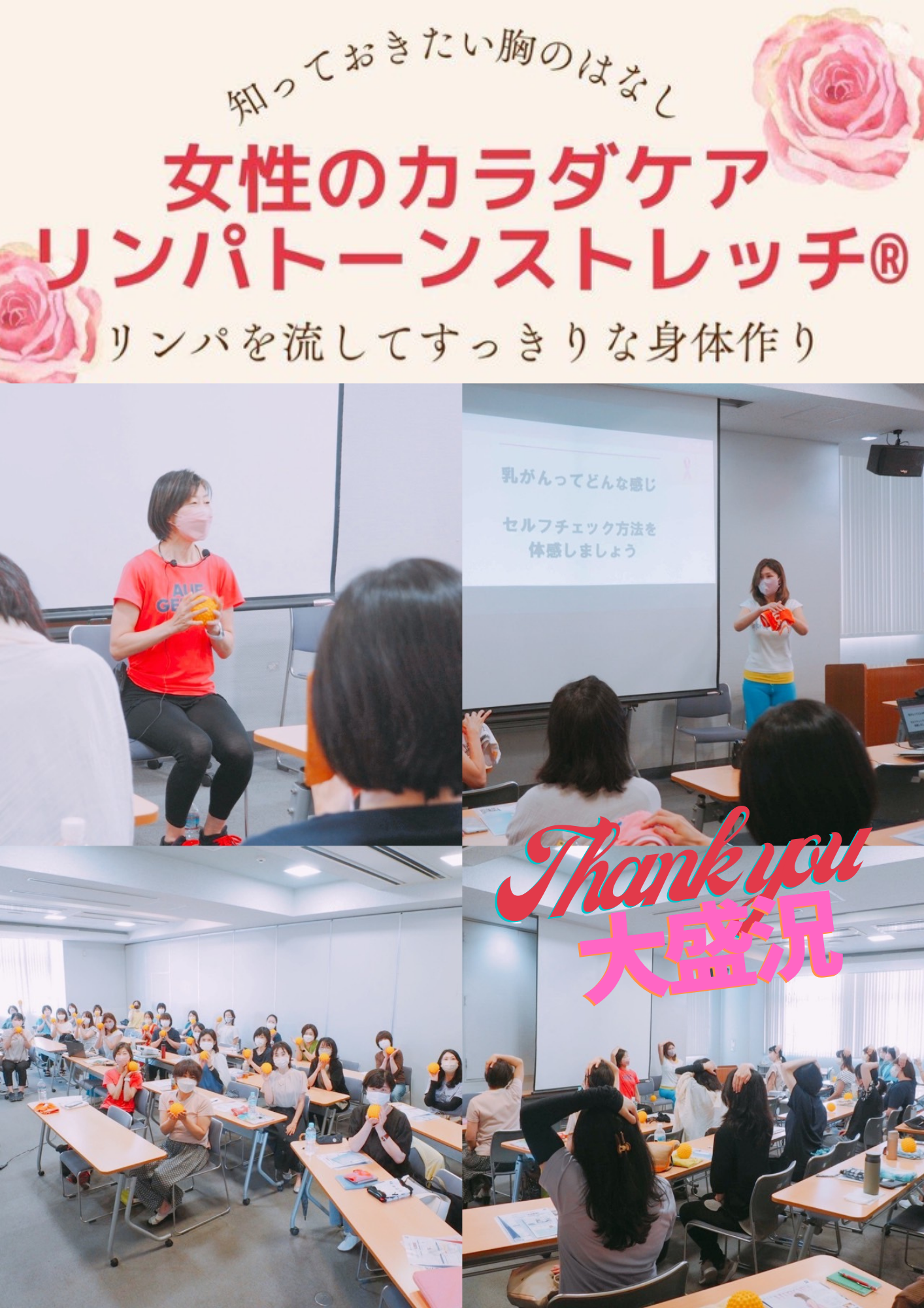 リンパと骨盤という女性の2大キーワードで満員御礼ありがとうございます。講師の私も皆さまの熱心な視線にパワーが出ました。 後半のリンパマッサージとストレッチでは 8割の方が爆睡状態(笑)心地よさを十分体感していただきました。