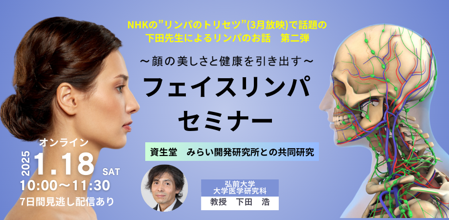 今回はリンパの毛細リンパ管と集合リンパ管から成るメッシュワーク、顔面の特異的なリンパ経路など、資生堂みらい開発研究所との共同研究から分かった最新情報を下田浩先生から学びます。