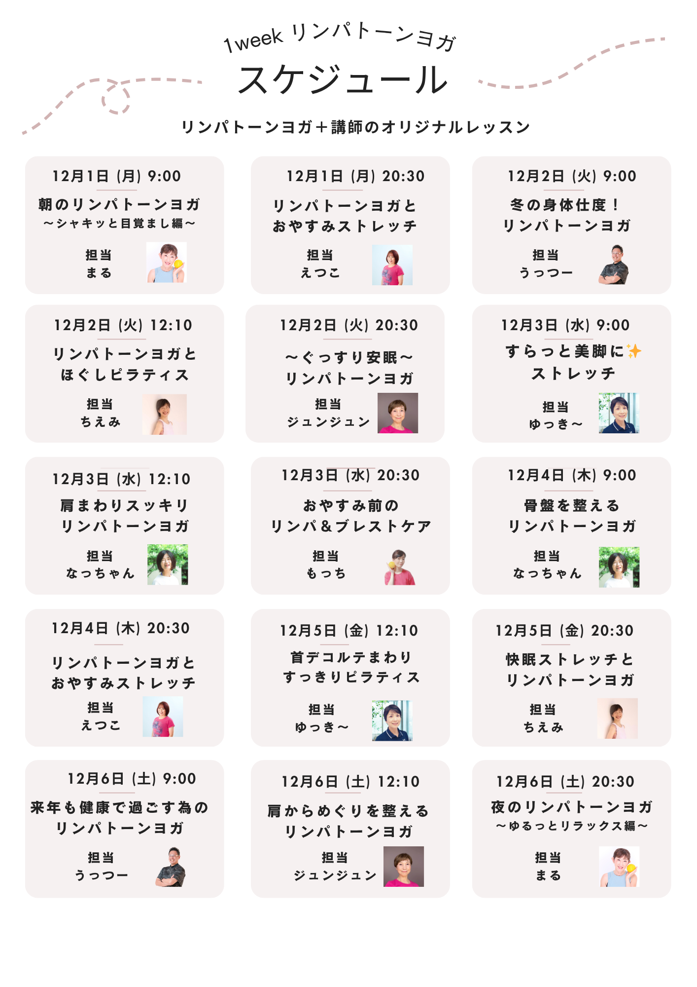 | ②オンラインレッスン「ブレストアウェアネス・チャレンジ」 | 日時 12月1日(月)~12月6日(土) 内容:リンパトーンヨガ+講師オリジナルレッスン |