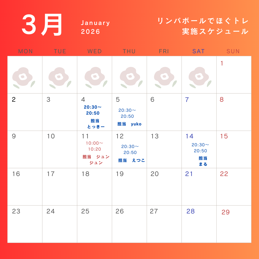 | 参加費 | 1ヶ月のみ 2,000円 3ヶ月継続 5,200円 1ヶ月のみ(リンパボール付き)4,400円 3ヶ月継続(リンパボール付き)7,400円 |